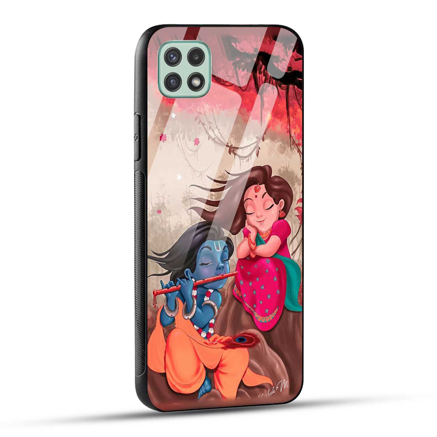 Samsung Galaxy A22 5G Back Cover Lord Krishna with His Flute & Radha Printed Glass Case