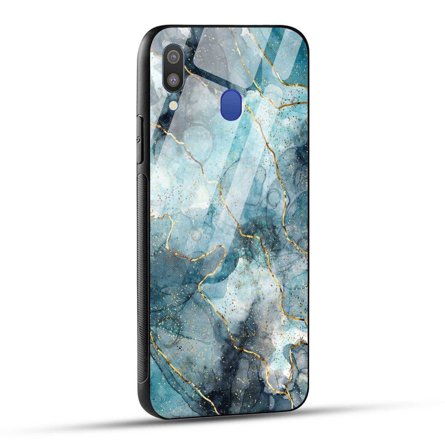 Samsung Galaxy M20 Back Cover Blue Gold Illustrated Marble Printed Glass Case